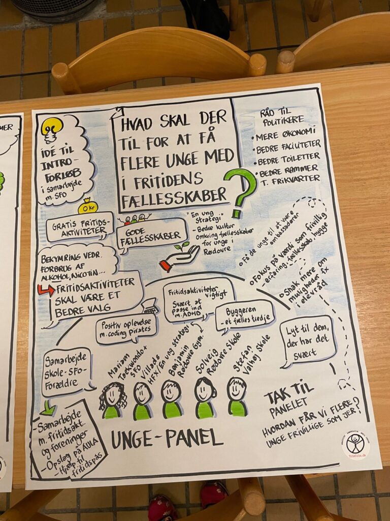 Fællesskab og trivsel for børn og unge. Det var emnet for borgermøde i Rødovre i oktober 2025, hvor jeg var hyret af Rødovre Kommune og tegnede grafisk referat af de mange input og pointer.